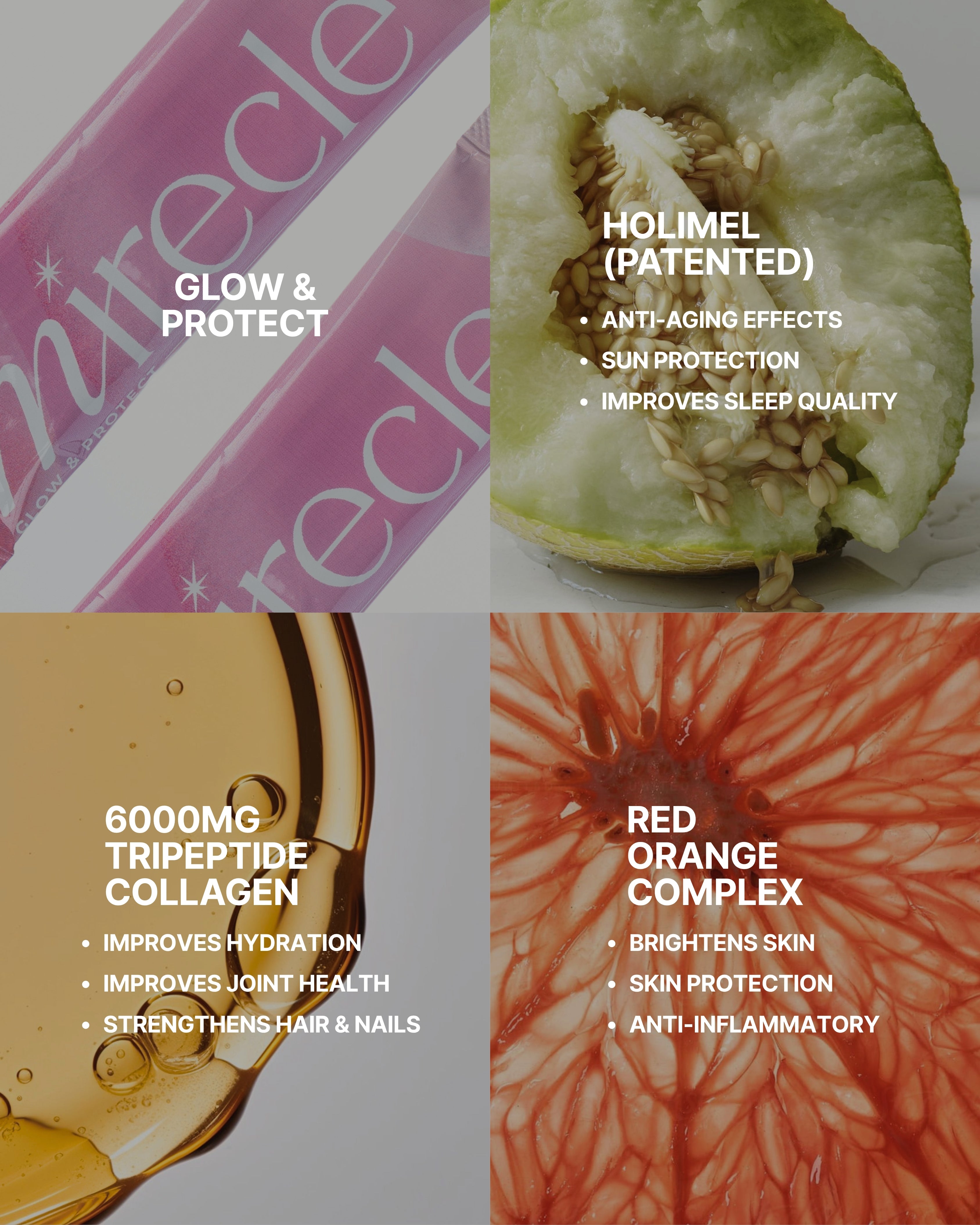 One sachet delivers 6,000mg of Collagen Tripeptide to support skin elasticity and hydration—while Holimel® and Red Orange Complex™ work together to defend against sun exposure and environmental aging.